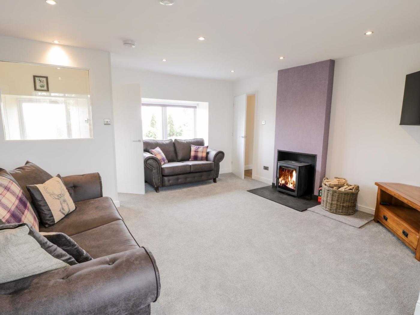 The holiday home features 2 bedrooms, a TV, a fully equipped kitchen with a dishwasher and an oven, a washing machine, and 1 bathroom with a shower. There is also a seating area and a fireplace.