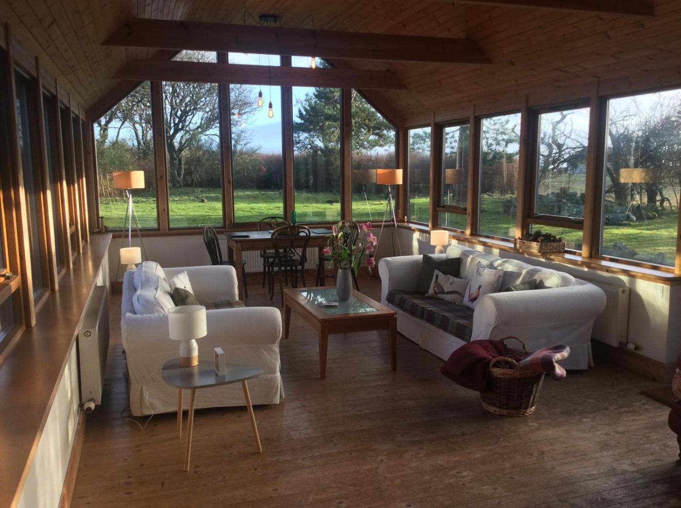 Holiday Home. The property has a large garden room with clear views of the garden and a wood burning stove.