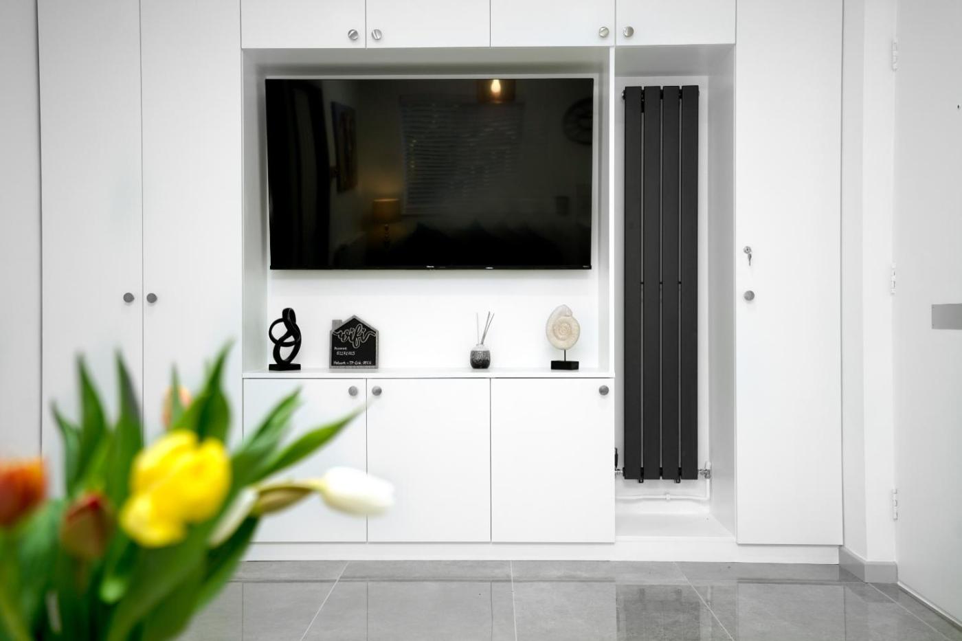Apartment with Shower. This apartment consists of 1 bedroom, a kitchen and 1 bathroom with a hairdryer. The fully equipped kitchen features a refrigerator, kitchenware, an oven and a microwave. The apartment provides a tea and coffee maker, a dining area, a wardrobe, a carpeted floor and a flat-screen TV with cable channels. The unit offers 1 bed.